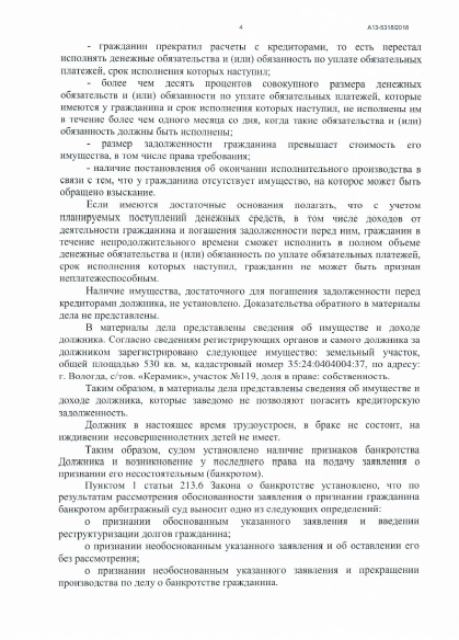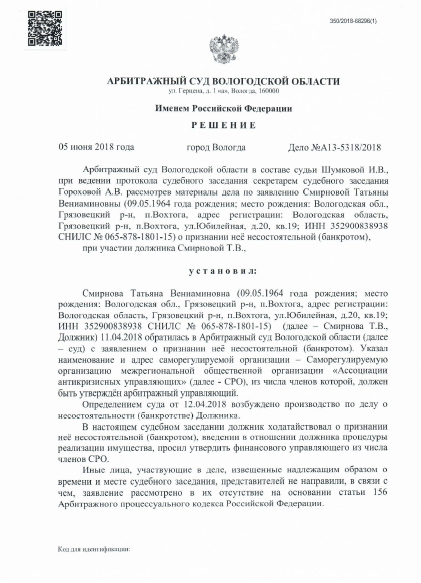 Признание арбитражным судом неспособности Смирновой Т.В. исполнять финансовые обязательства и вести расчеты с кредиторами.