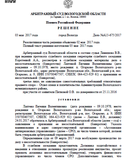 Признание арбитражным судом неспособности Лаптевой Е.В. исполнять финансовые обязательства и вести расчеты с кредиторами.